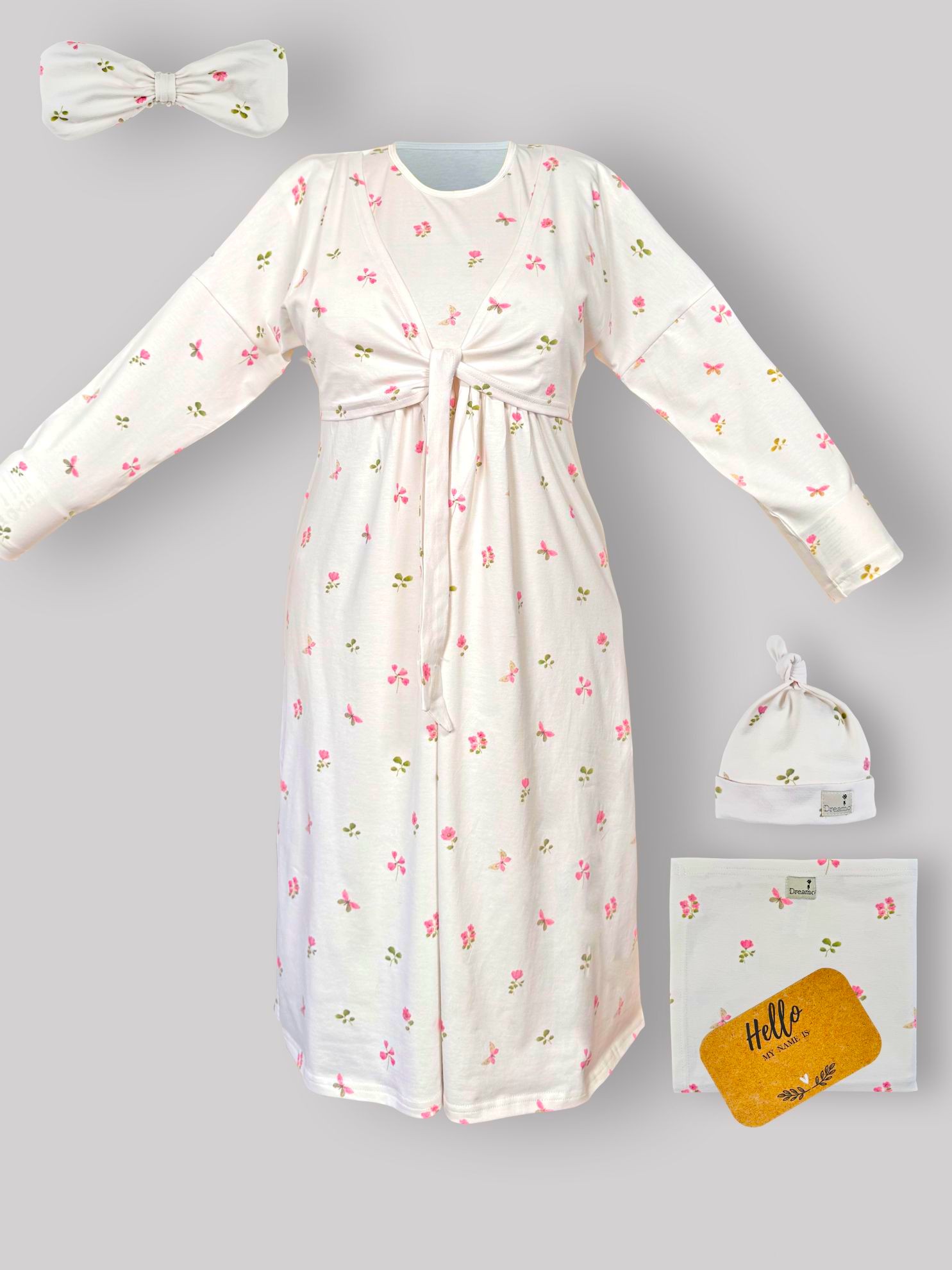 ست پیراهن بارداری،شیردهی و زایمان طرح پروانه(سایز1) – همراه با دورپیچ و کلاه و هدبند مادر