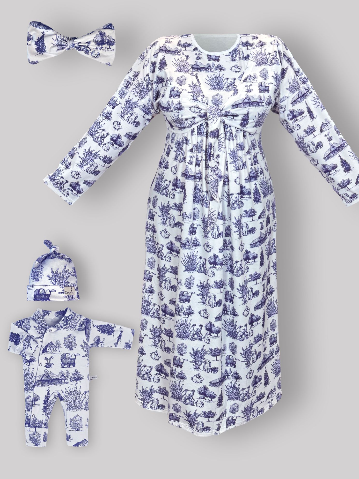 ست پیراهن بارداری/شیردهی/زایمان طرح ویلیج-Village(سایز2) – همراه با سرهمی و کلاه و هدبند مادر