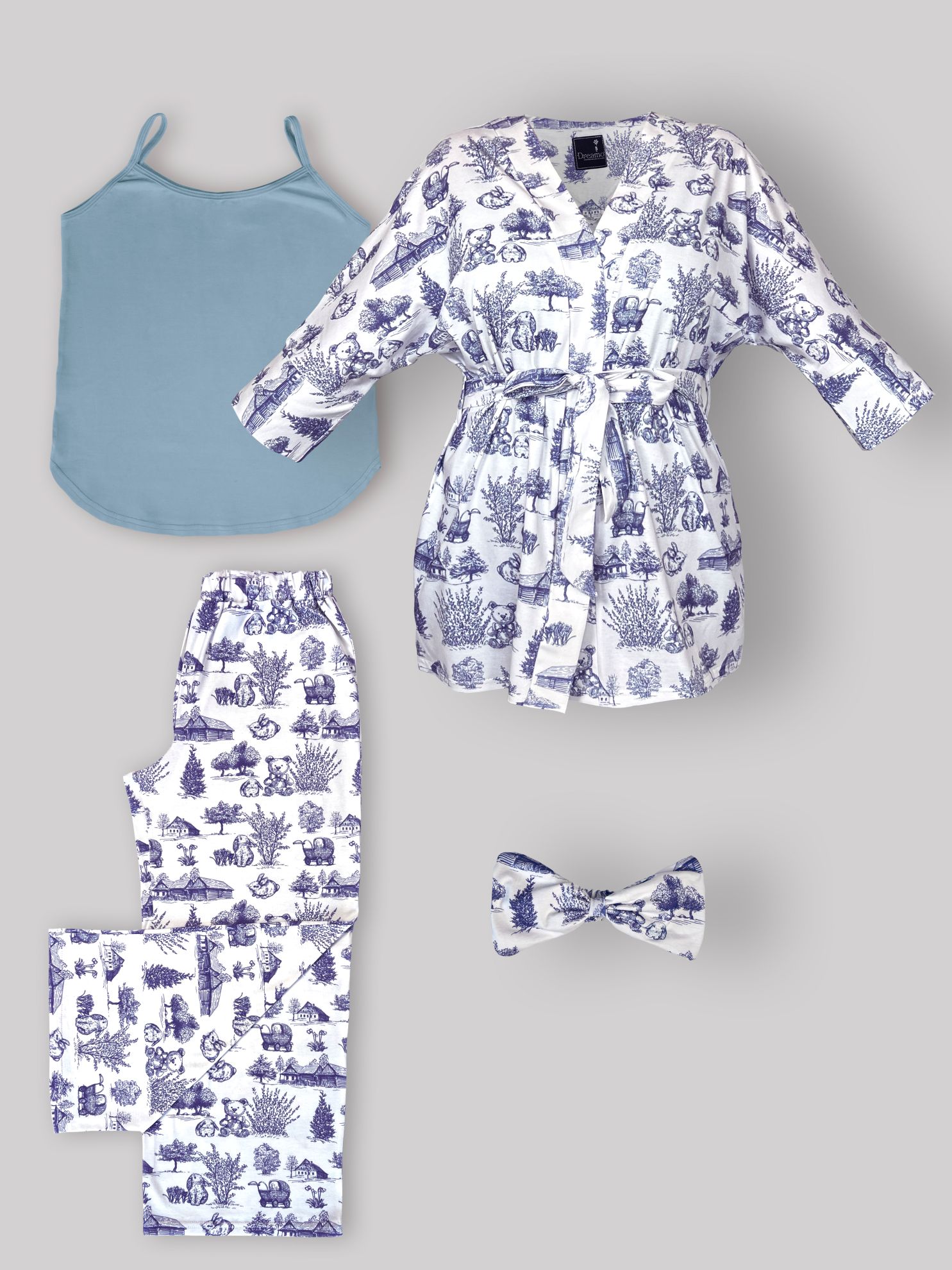 ست 6 تکه بیمارستانی طرح تدیTeddy-روبدوشامبر طرح دار(با هدبند مادر) ،تاپ تک رنگ نسکافه ای سایز1،شلوار طرح دار واید +دورپیچ و کلاه