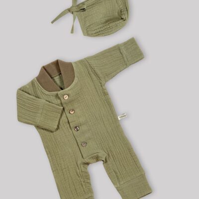 ست سرهمی دکمه دار و کلاه نوزاد موسلین وارداتی – طرح زیتون