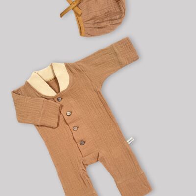 ست سرهمی و کلاه نوزاد-جنس موسلین- تک رنگ -رنگ دارچینی