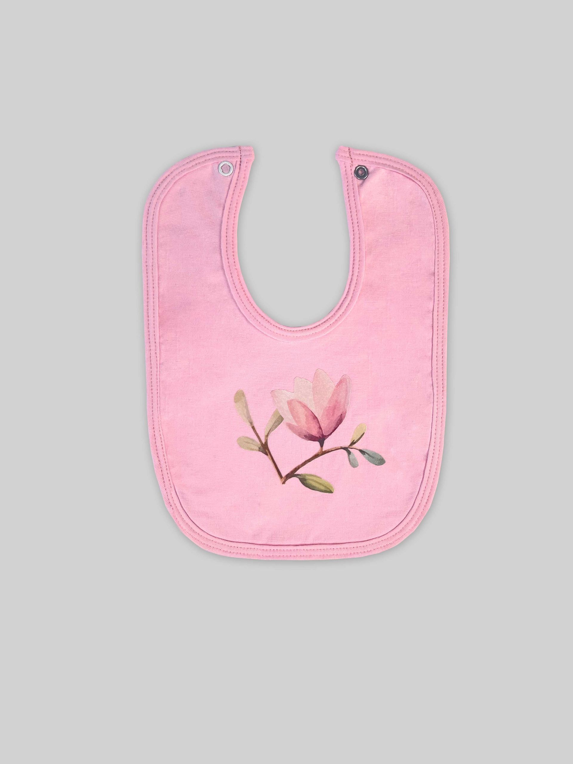پیشبند نوزاد تک رنگ صورتی با استیکر طرح مگنولیا