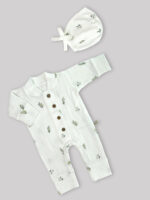 ست سرهمی دکمه دار و کلاه نوزاد موسلین – طرح زیتون