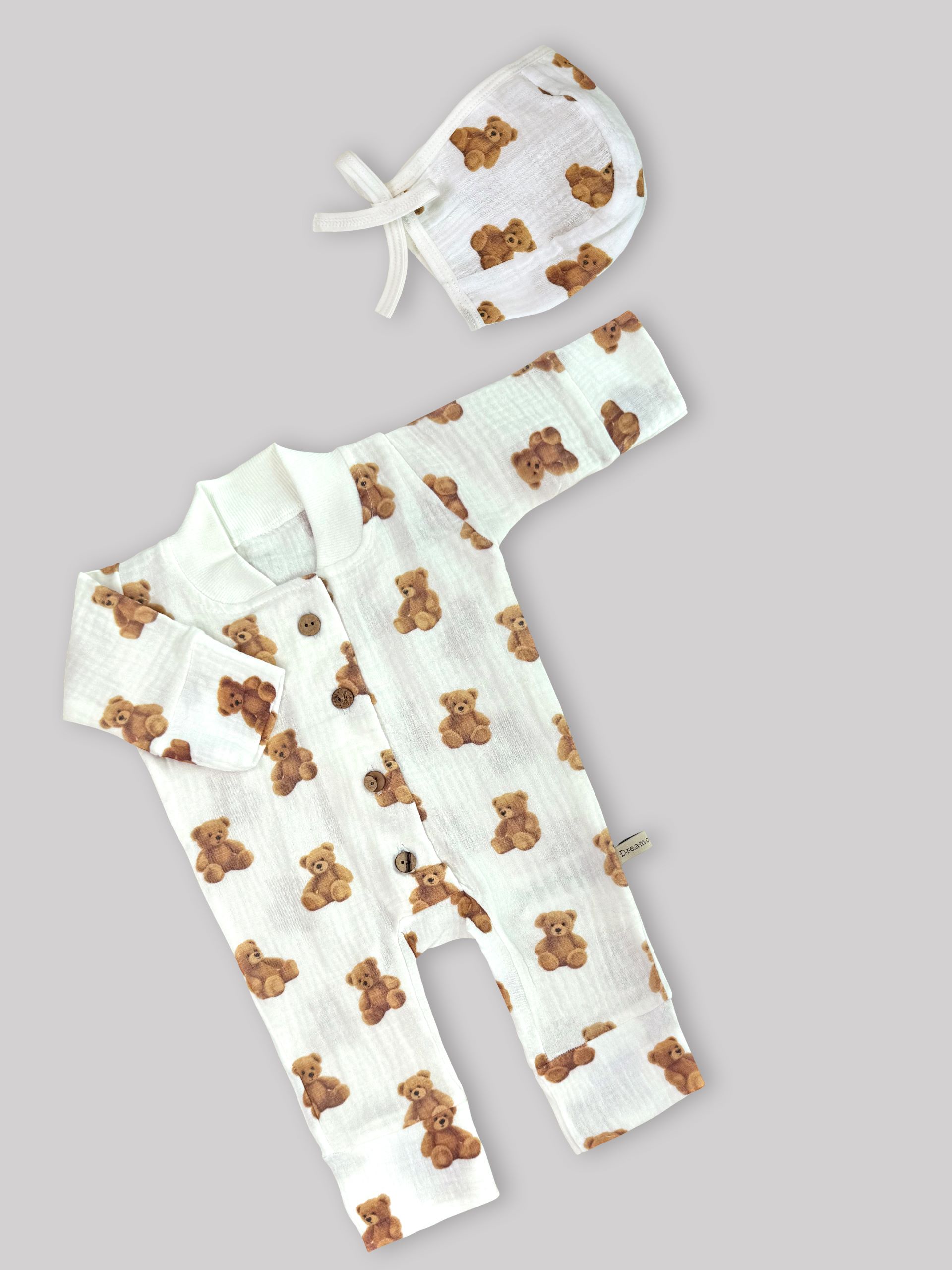 ست سرهمی دکمه دار و کلاه نوزاد موسلین – طرح تدی (Teddy)