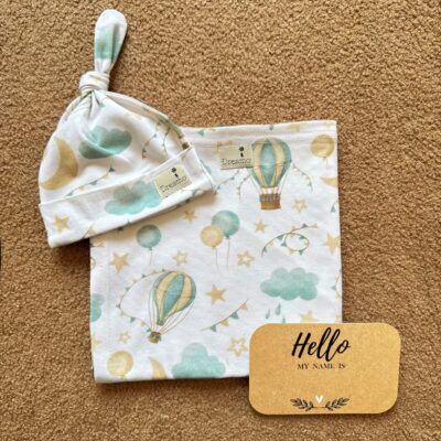 ست دورپیچ و کلاه نوزاد طرح بالن آبی(قنداق استاندارد پزشکی)