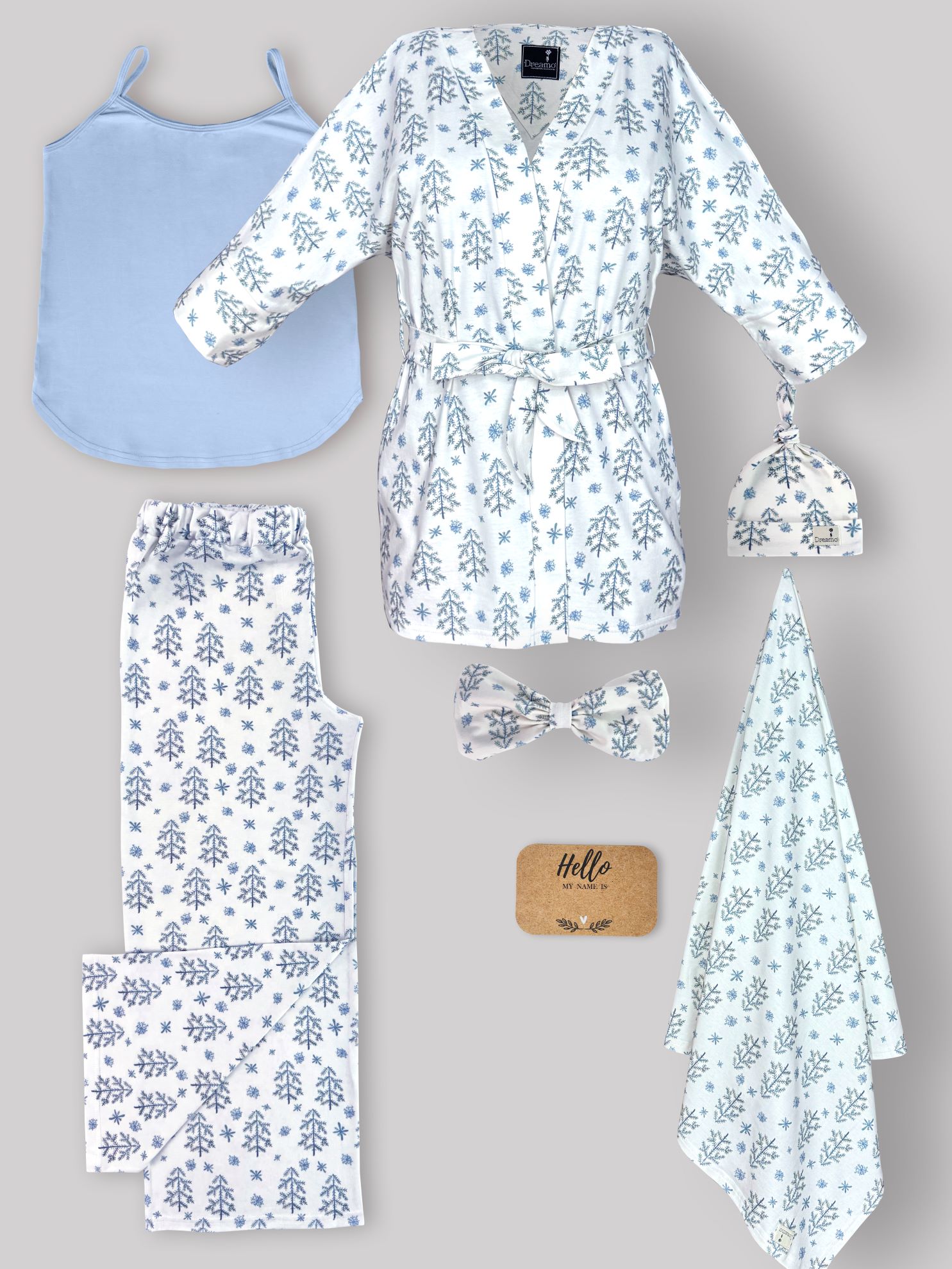 ست 6 تکه بیمارستانی طرح Winter-روبدوشامبر طرح دار(با هدبند مادر) ،تاپ آبی روشن سایز2،شلوار طرح دار واید +دورپیچ و کلاه