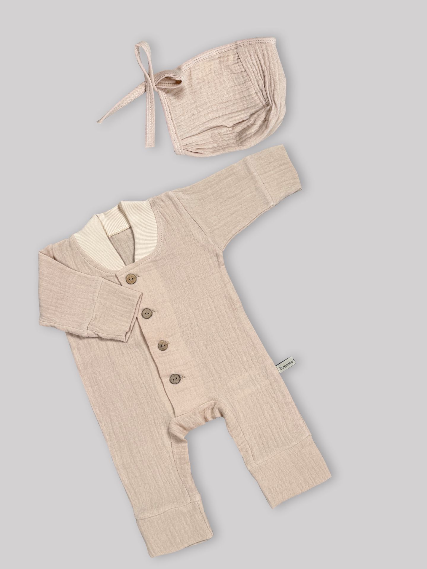ست سرهمی و کلاه نوزاد-جنس موسلین- تک رنگ -رنگ کرم