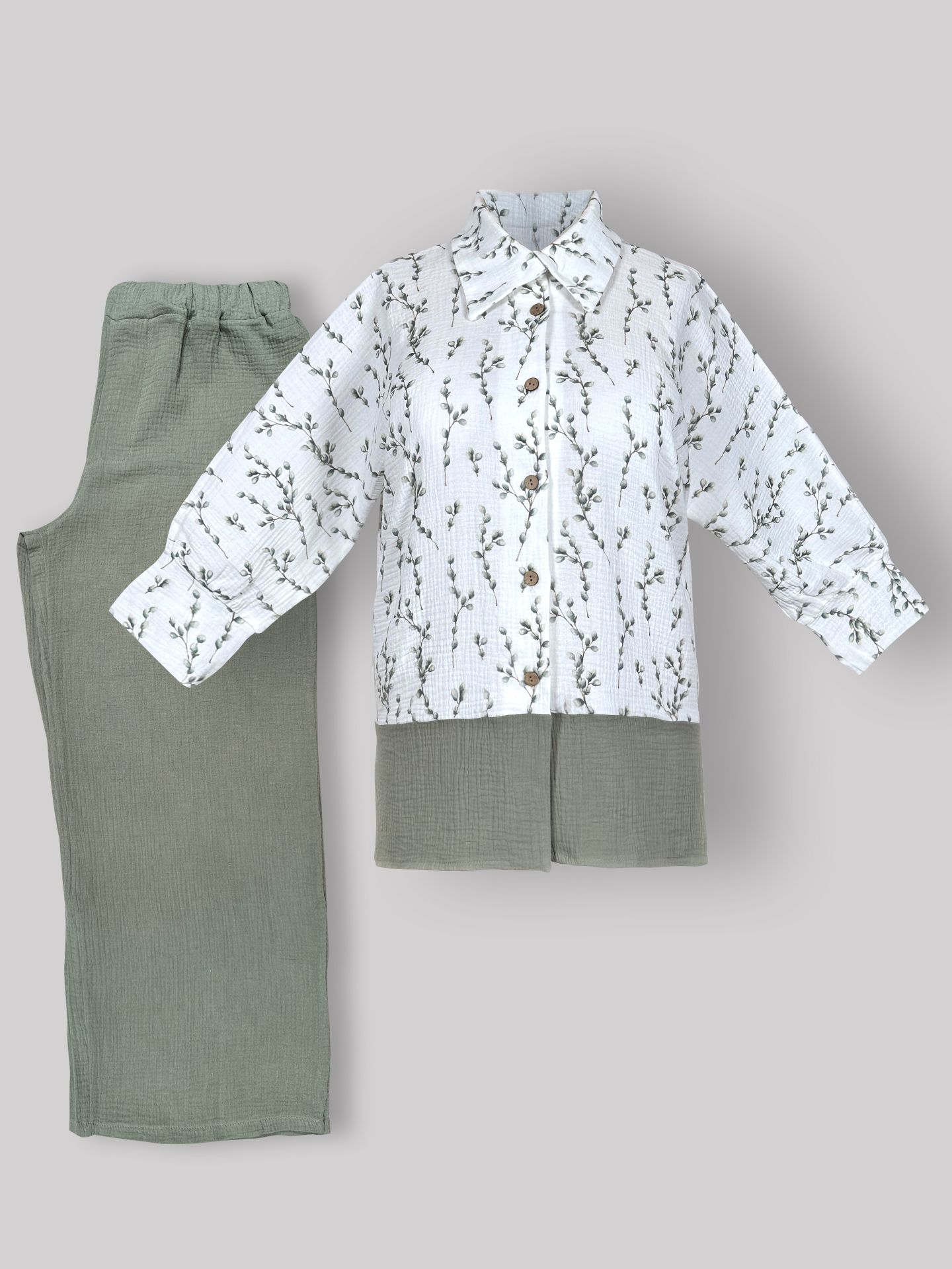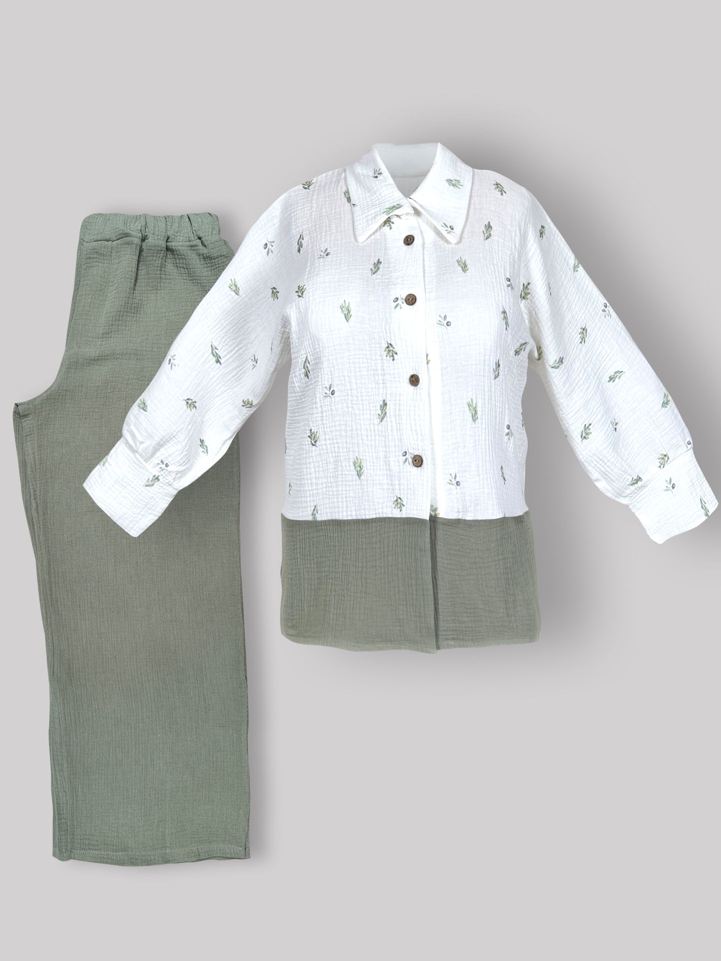 ست شومیز (طرح زیتون) و شلوار سبز موسلین