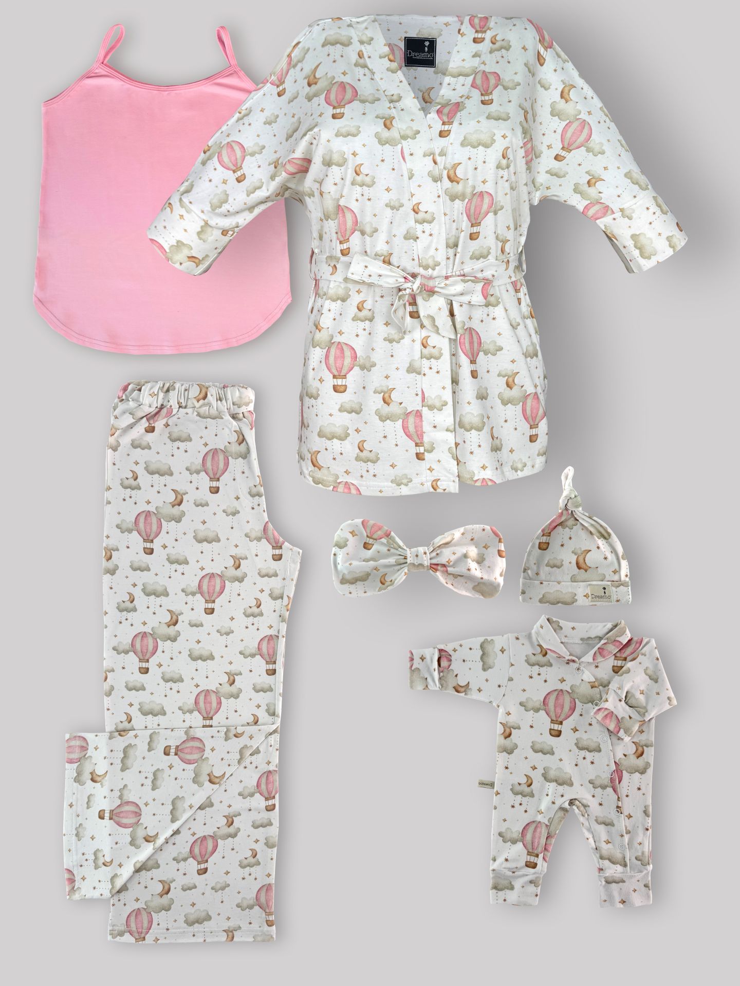 ست بیمارستانی مادر و نوزاد 6تکه پنبهٔ ارگانیک طرح بالن صورتی(تاپ صورتی) با سرهمی و کلاه سایز 2 | برند دریمو