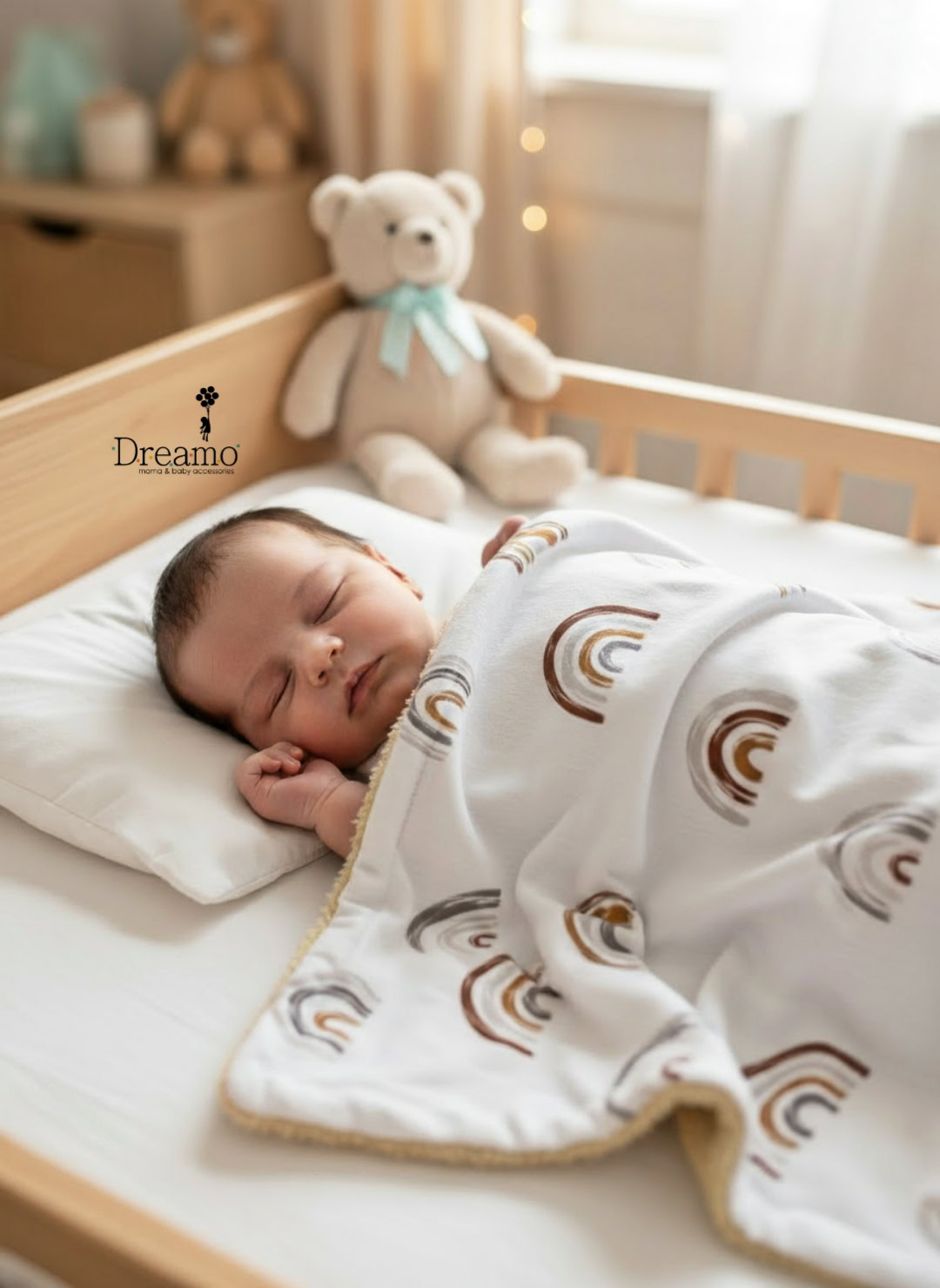 عنوان: پتو دورپیچ نوزاد 2لایه (پشت تدی) – راحتی و گرما برای کوچکترینها با ابعاد 80 در 90 سانت