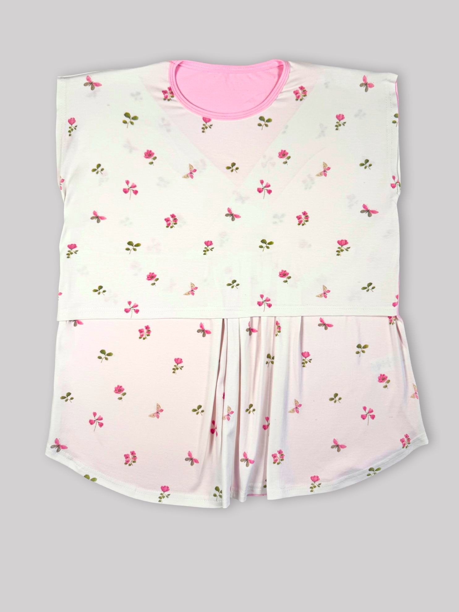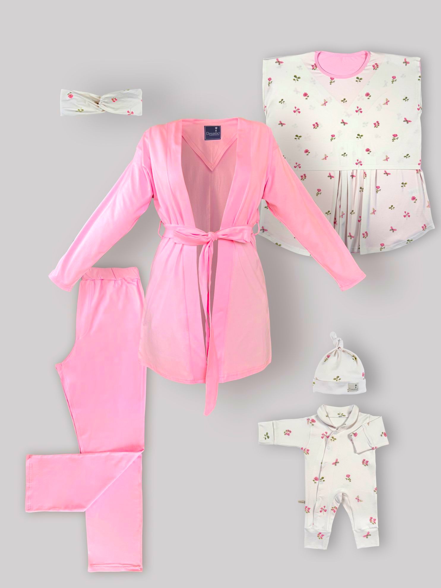 ست لباس بارداری / شیردهی مادر و نوزاد 6تکه پنبهٔ ارگانیک طرح پروانه با سرهمی و کلاه سایز 2 | برند دریمو