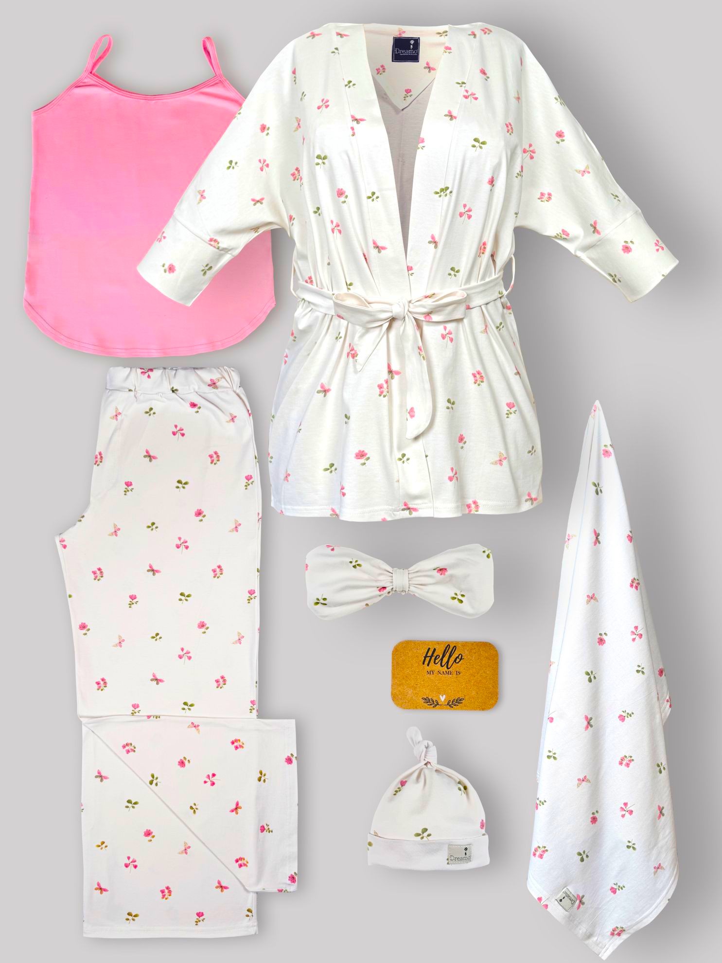 ست بیمارستانی مادر و نوزاد 6تکه پنبهٔ ارگانیک طرح پروانه با دورپیچ و کلاه سایز 2 | برند دریمو