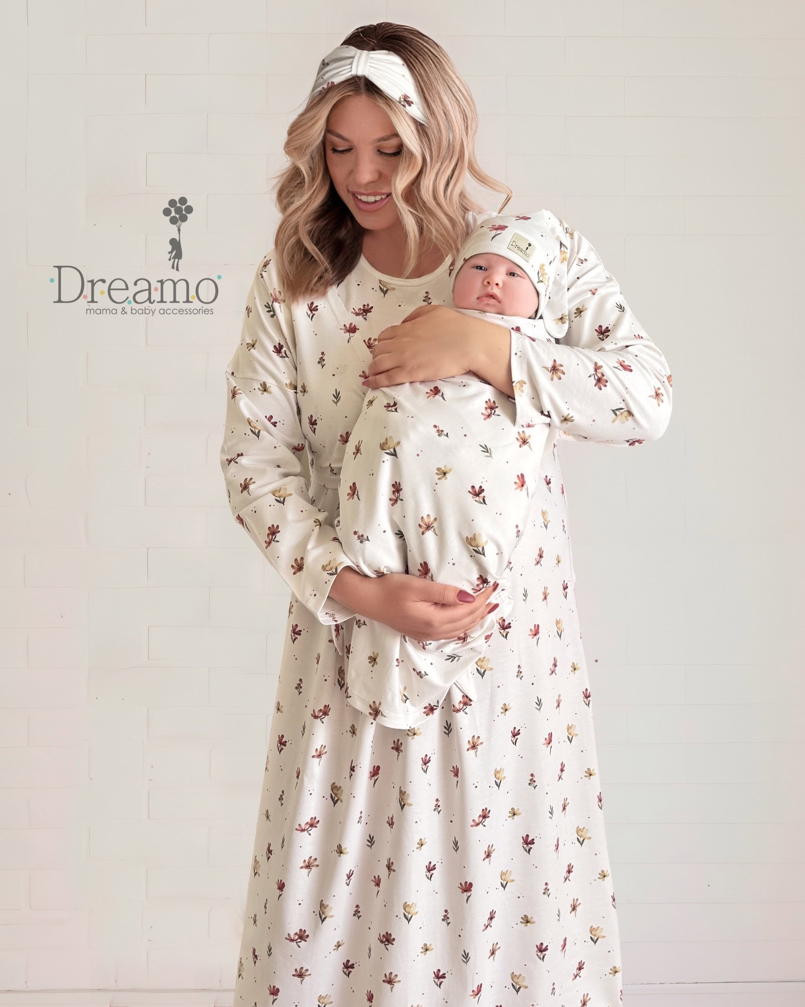 ست پیراهن بارداری،شیردهی و زایمان طرح ماریگلد-Marigold با دورپیچ و کلاه (سایز2)