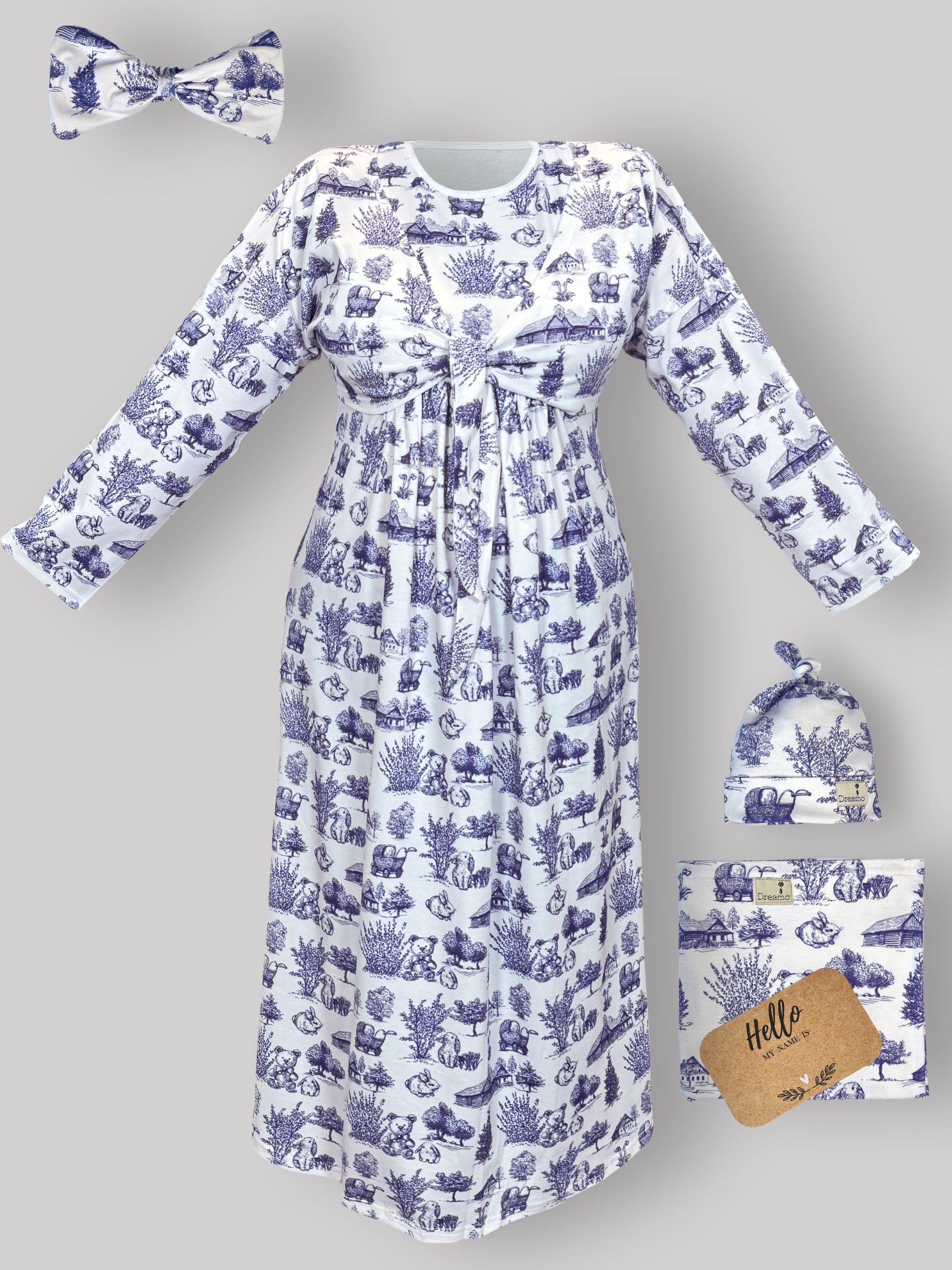 ست پیراهن بارداری،شیردهی و زایمان طرح ویلیج-Village(سایز1) – همراه با دورپیچ و کلاه و هدبند مادر