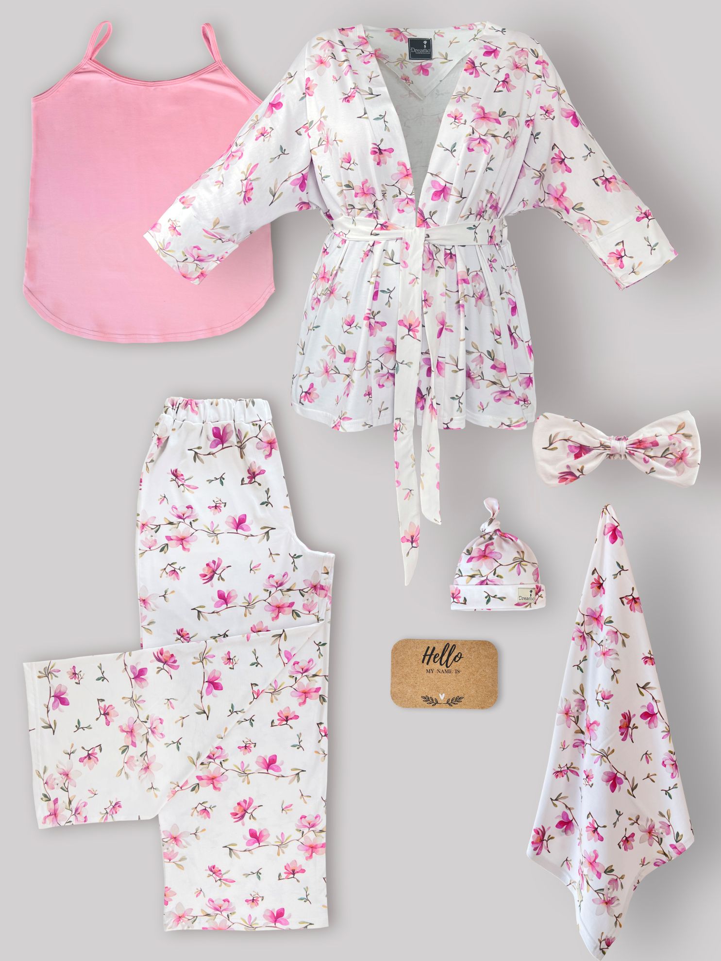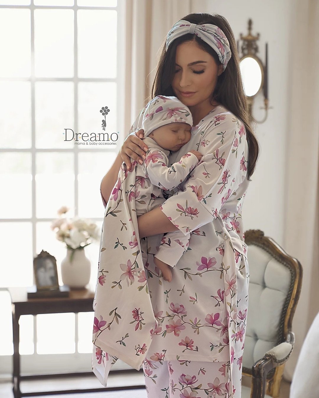 ست بیمارستانی مادر و نوزاد 6تکه پنبهٔ ارگانیک طرح مگنولیا با دورپیچ و کلاه سایز 1 | برند دریمو