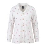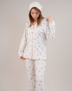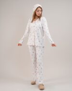 بلوز این ست دارای مدل جلو دکمهدار و یقه شکاری مدل دار هست که هم پوشیدن آن را آسان میکند و هم ظاهری شیک و مرتب به استایل خانگی میبخشد.