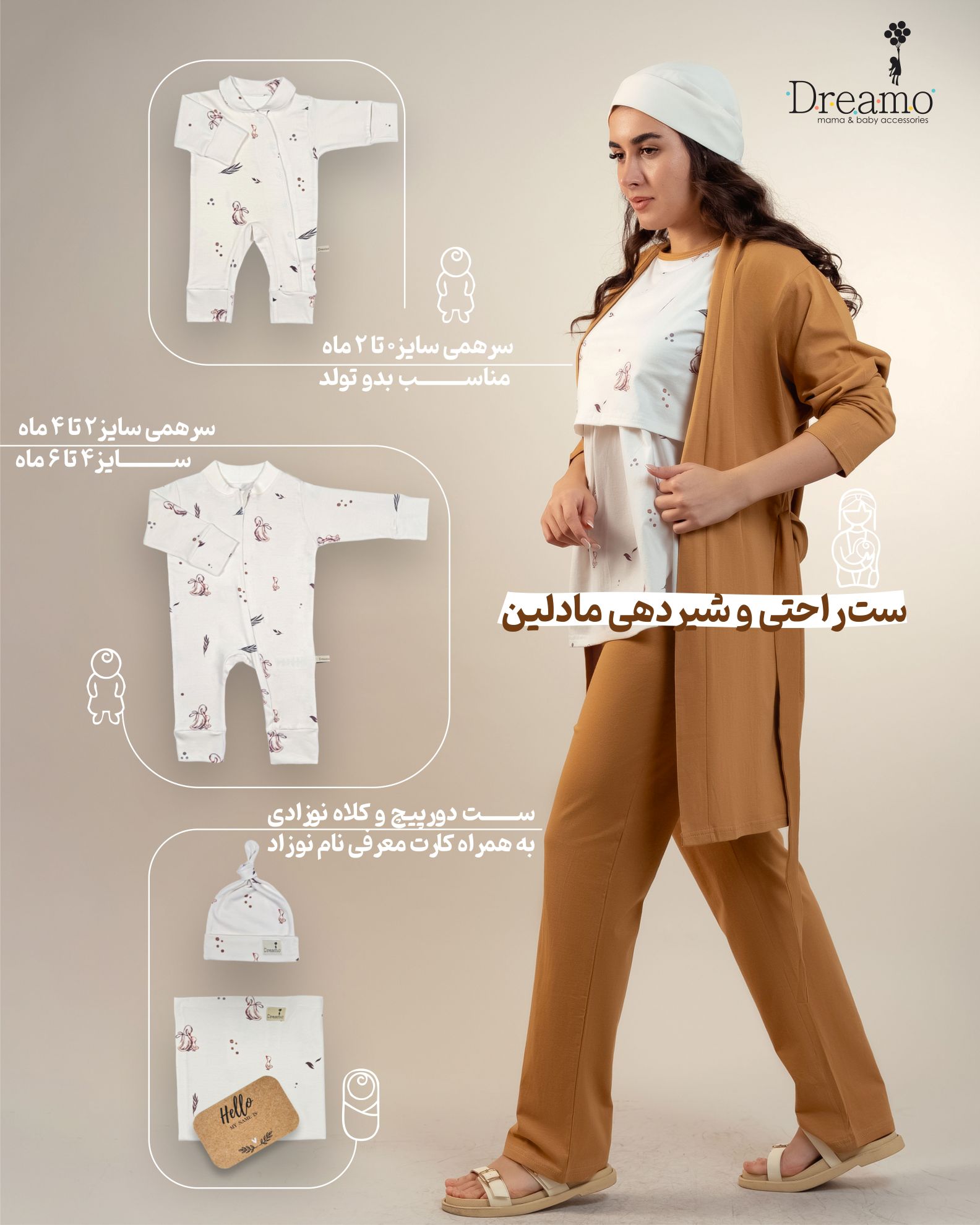 ست لباس بارداری / شیردهی مادر و نوزاد 6تکه پنبهٔ ارگانیک طرح مادلین با سرهمی و کلاه سایز 1 | برند دریمو