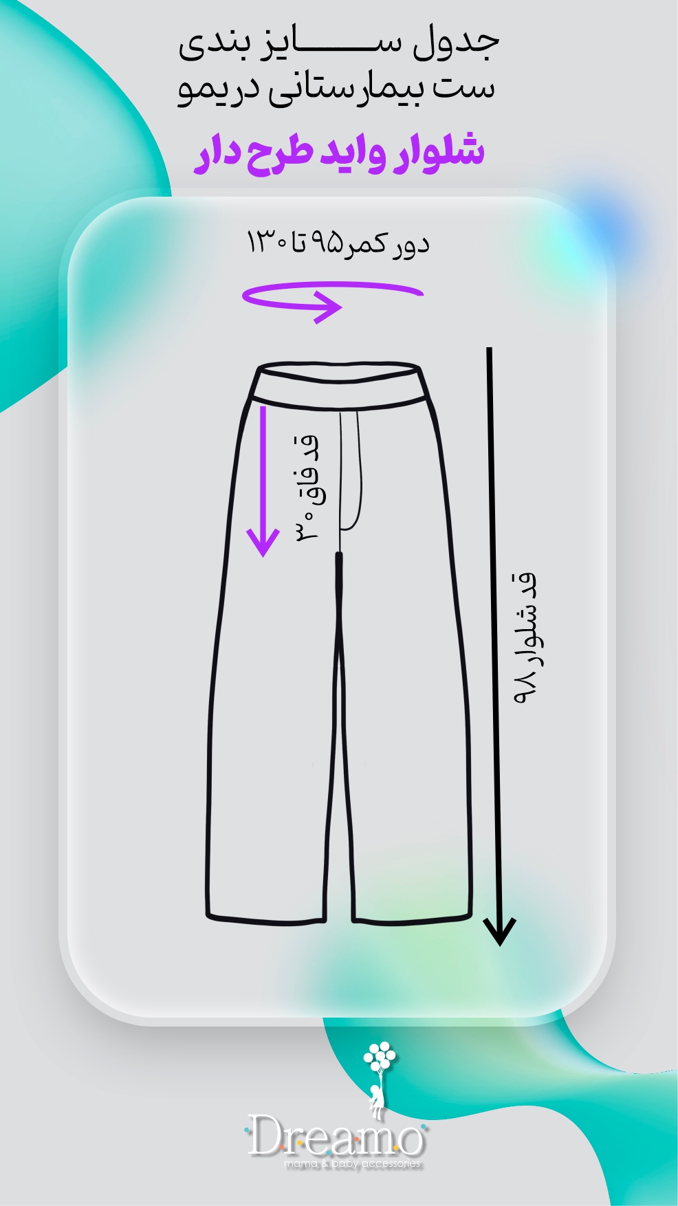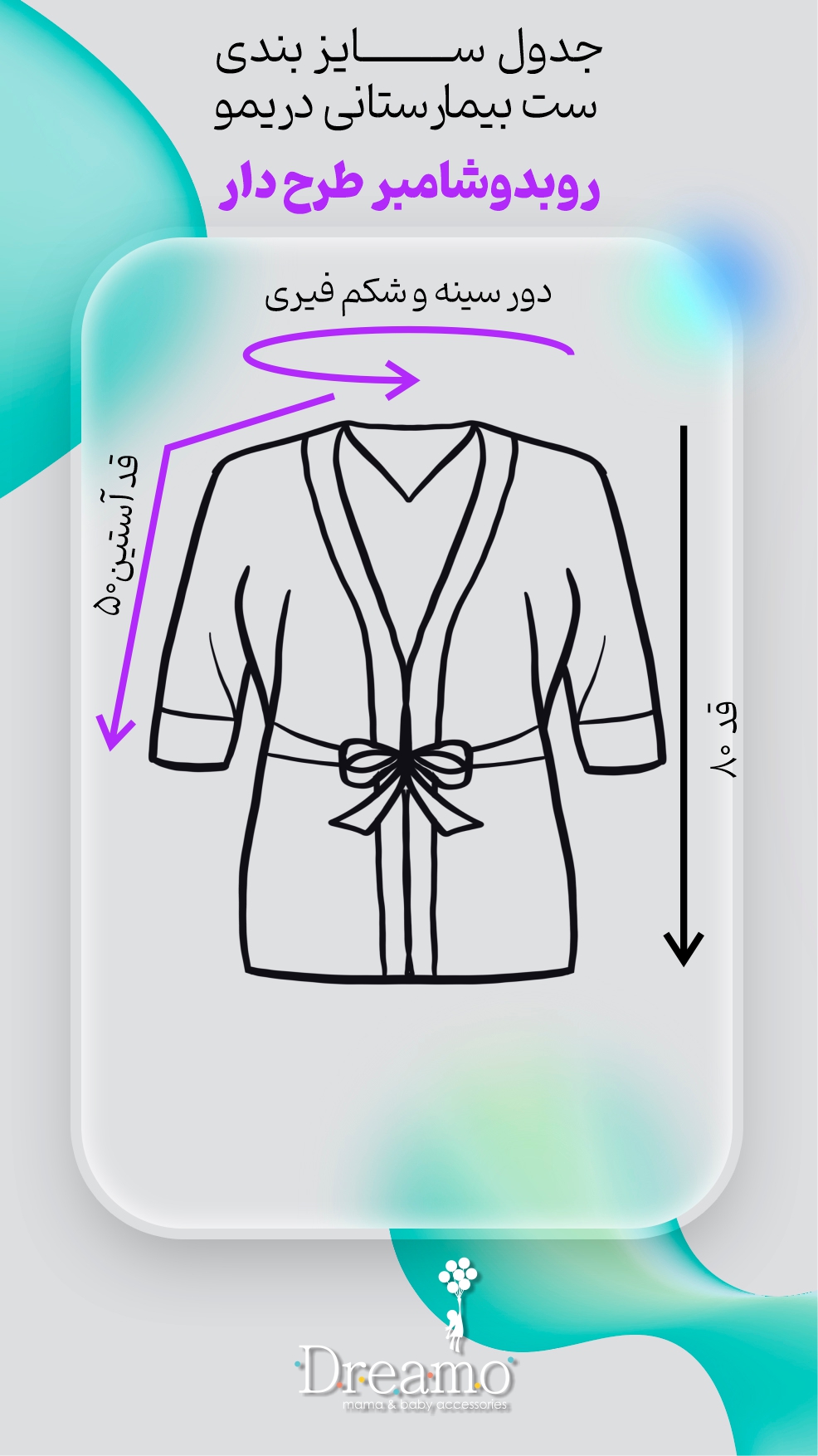 | روبدوشامبر | اندازه ها به سانتیمتر | تاپ بندی | اندازه ها به سانتیمتر | شلوار واید | اندازه ها به سانتیمتر |