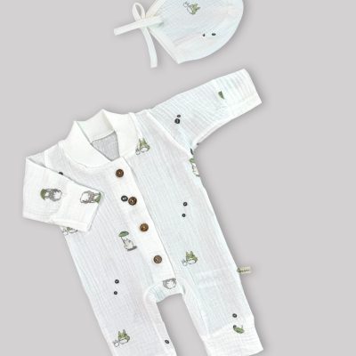 ست سرهمی دکمه دار و کلاه نوزاد موسلین وارداتی – طرح زیتون